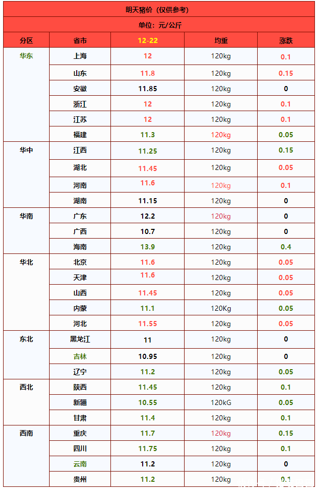 从分区来看,在全国重点数据监控的28个地区,下跌地区集中在西南、西北以及华中部分地区,而华北、华东以及华中地区,猪价上涨现象增多!目前,在北方市场,黑吉辽地区生猪报价偏稳,均价在10.95~11.2元/公斤,在山西以及河北报价在11.45~11.55元/公斤,陕甘地区报价在11.4~11.45元/公斤。在南方市场,川渝报价在11.7~11.75元/公斤,云贵报价在11.2元/公斤,山东以及安徽报价在11.8~11.85元/公斤,江浙地区报价在12元/公斤,河南报价在11.6元/公斤,两湖报价在11.15~11.45元/公斤,两广报价在10.7~12.2元/公斤!
